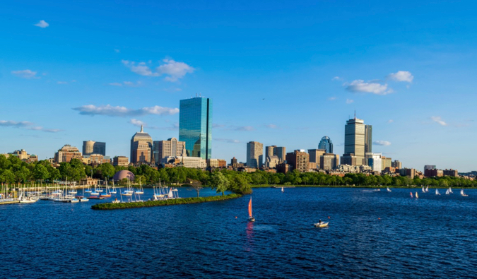 The Boston skyline as seen from the river on a bright summer day