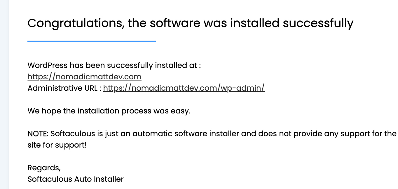 Once the installation process has finished, you will be given the URL to go to so you can log in to your WordPress site. Take note of the URL as it will be how you log in to your website from now on. For reference, the login URL will always be your domain name followed by /wp-admin/ as per the below example:
