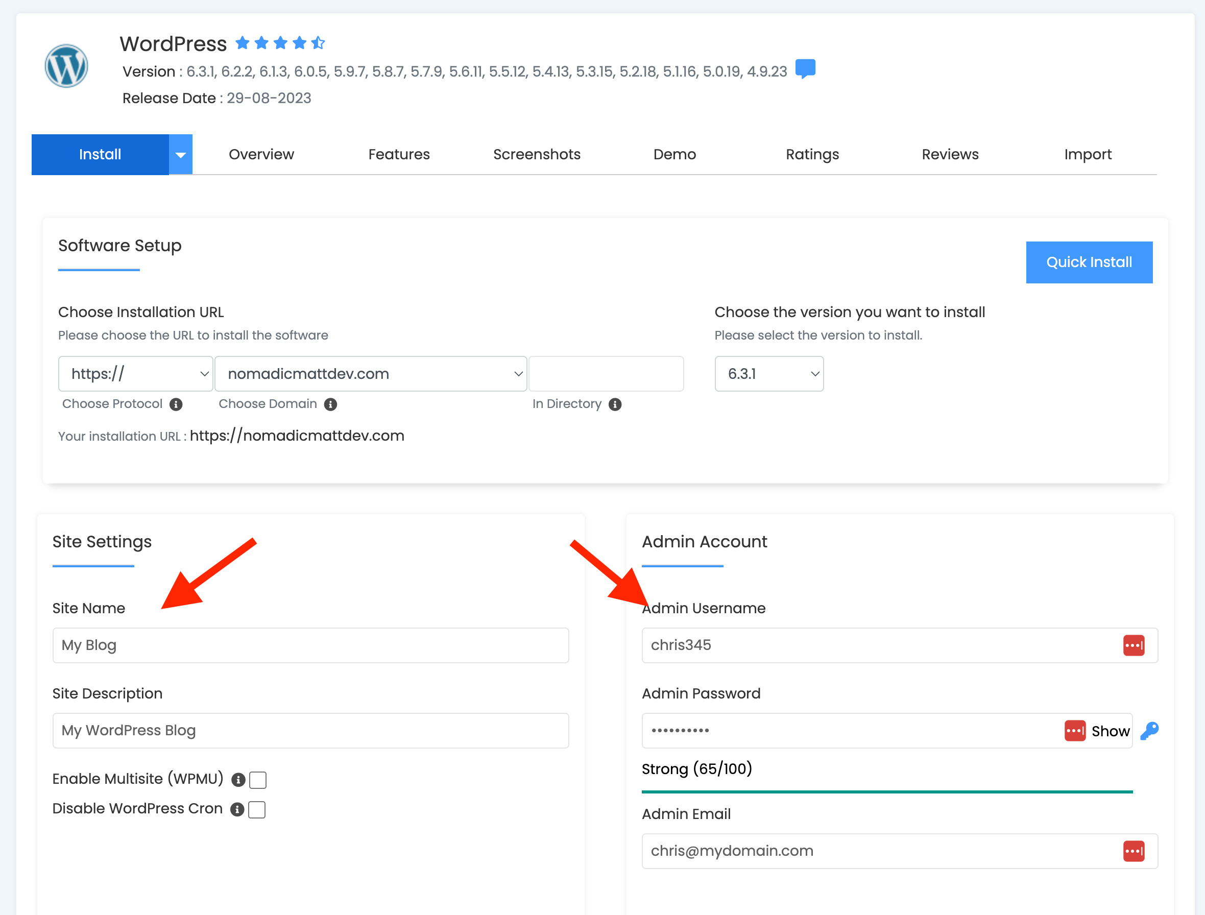 In the admin account area on the right make sure the admin username is hard to guess, do not leave it as “admin”, add your email address, and set a password you’ll use to log in to your WordPress website.